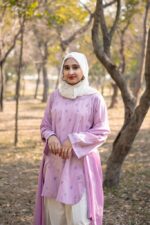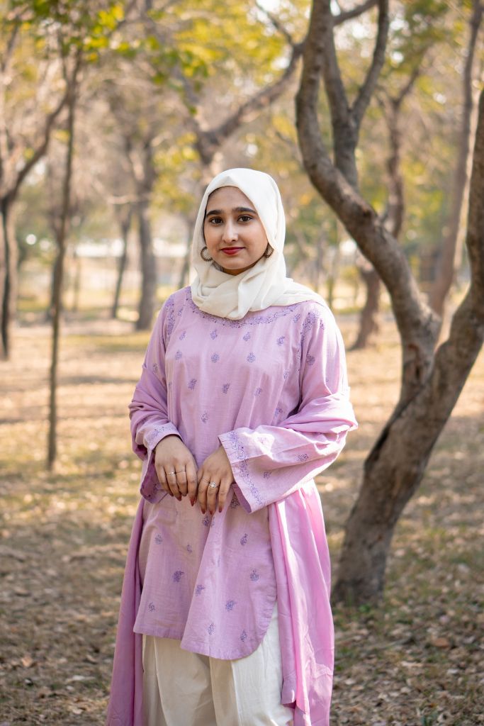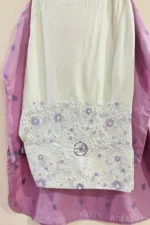 Step into refined elegance with this exquisite hand-embroidered three-piece. It includes a lilac short shirt embellished with chikankari hand embroidery, a dyed pure silk (2.75 Yard) dupatta finished with a sleek border, and Kashmiri tanka hand-embroidered farshi shalwar. This beautiful dress is an ideal balance of heritage and modern wear.
