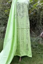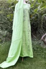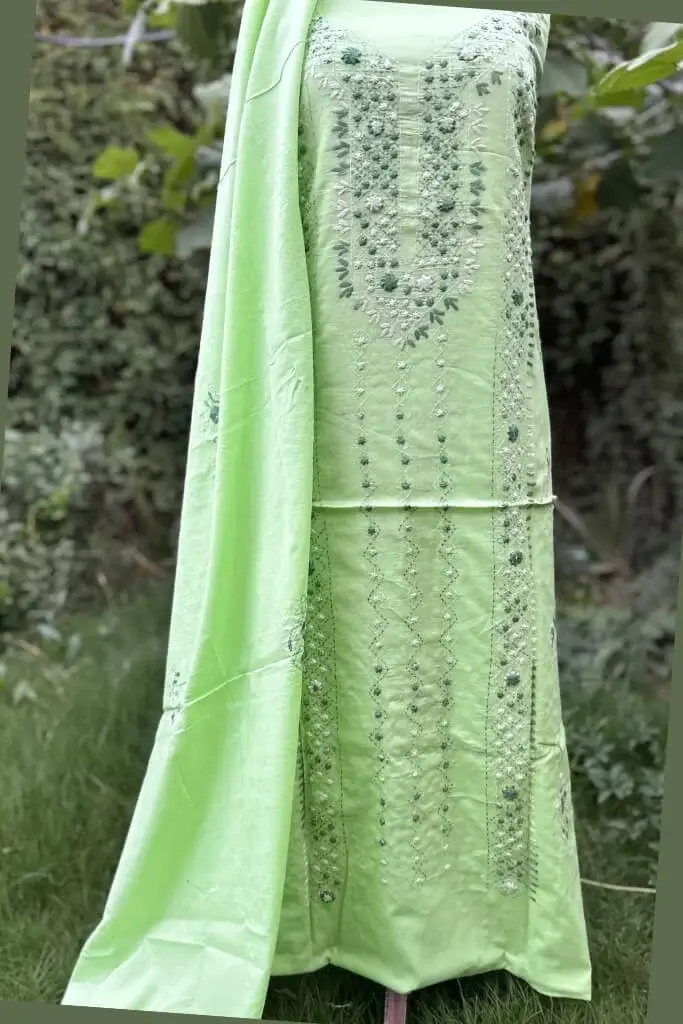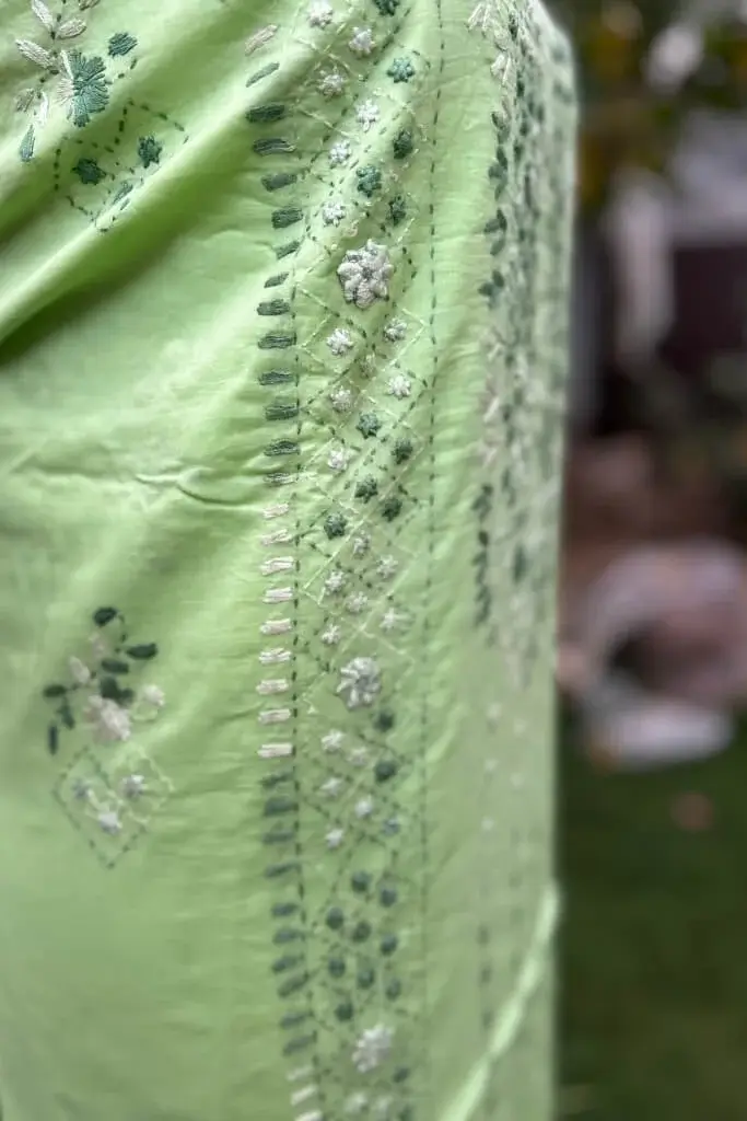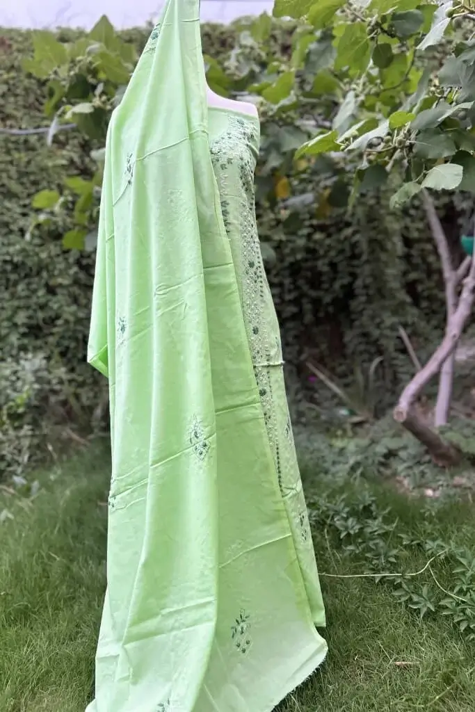 A modern take on traditional elegance, this pistachio hand-embroidered lawn suit is all about subtle beauty. The detailed embroidery adds a luxe finish to a minimalist silhouette.