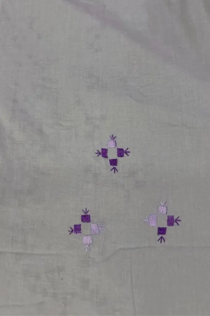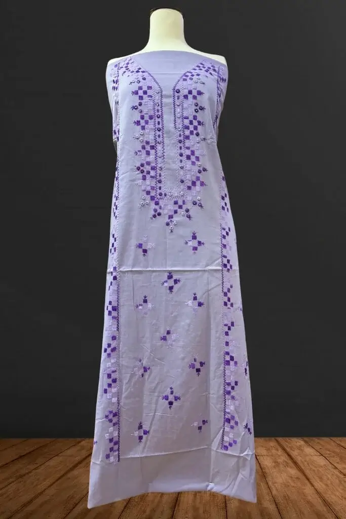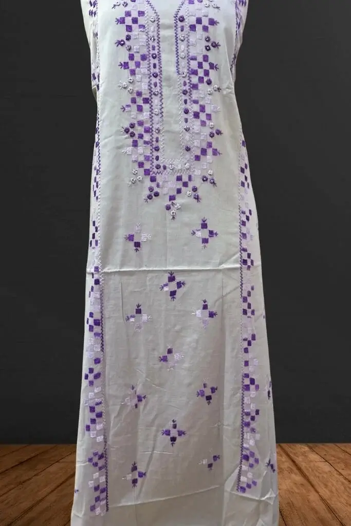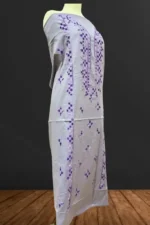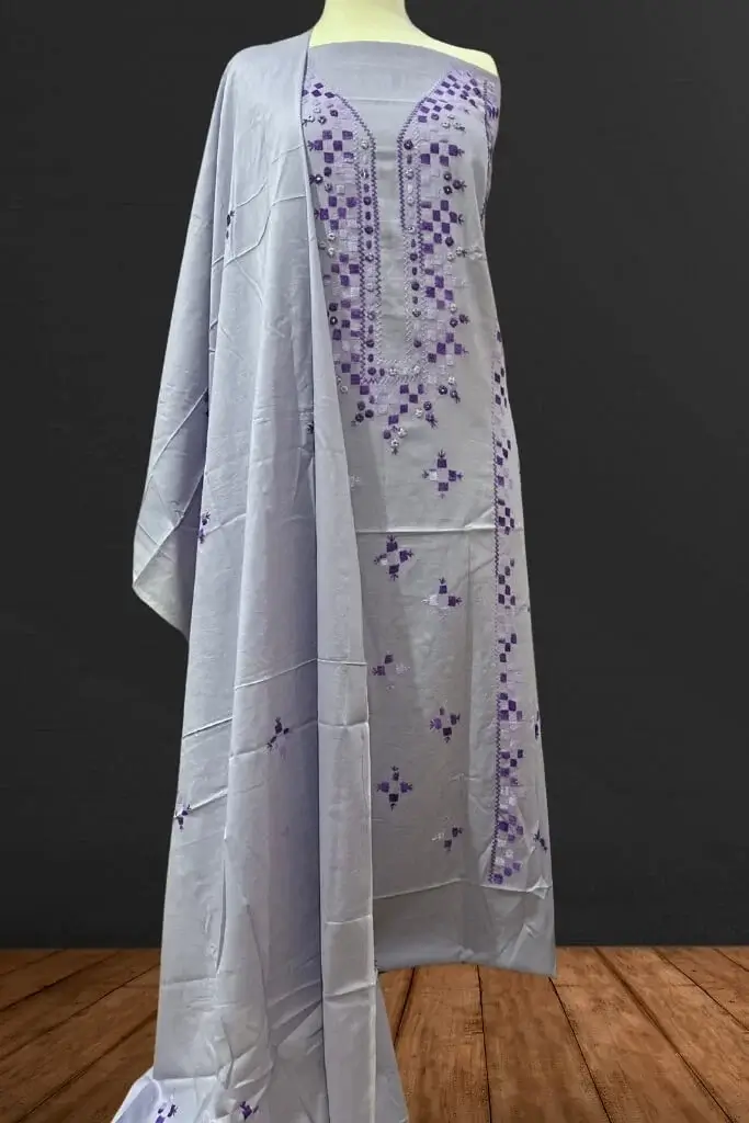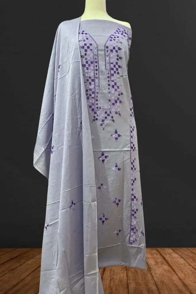Where classic tones meet fresh flair, this light gray lawn suit features chic violet embroidery on the front, sleeves, and dupatta that adds a graceful pop of color to your everyday look.